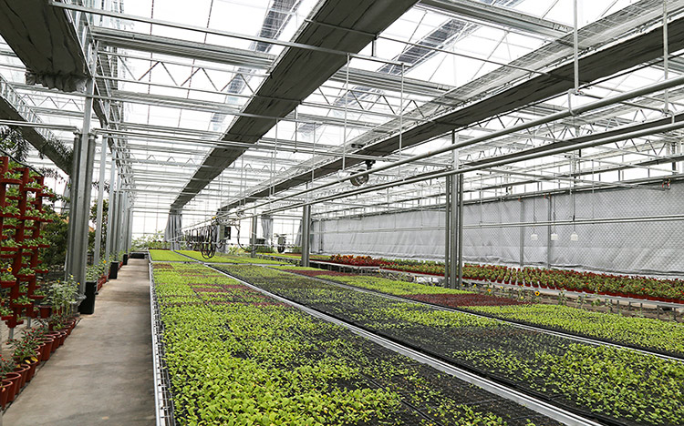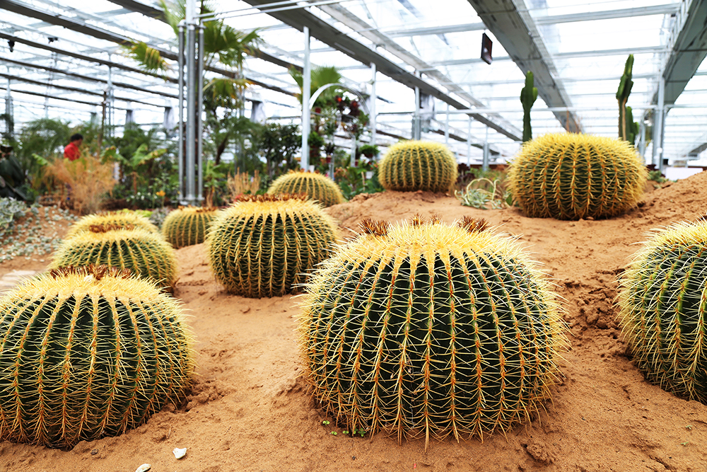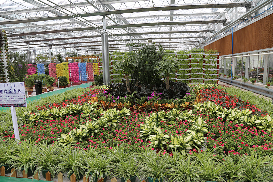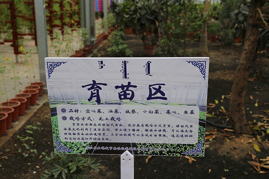 智能溫室大棚占地約6000平方米,分為一號廳和二號廳。其中一號廳是新建的有錯層的玻璃溫室,分為盆栽花卉、盆栽果樹區(qū)、沙生植物區(qū)、熱帶風(fēng)情區(qū)、家庭園藝區(qū)等功能區(qū)。二號廳由舊溫室改造而成,頂部為陽光板,四周立面為玻璃,配置了智能控制系統(tǒng),有無土栽培區(qū)、育苗區(qū)、采栽體驗區(qū)等功能區(qū)。智能溫室全部配備了內(nèi)、外保溫系統(tǒng),冬季保溫,比普通溫室更節(jié)能。溫棚內(nèi)移動苗床一次育苗30萬株,可供給巴彥霍德406座溫棚,一定程度上帶動了農(nóng)民增收。不論是熱帶植物、水果還是沙漠植物,在這里你可以一覽無余,一年四季感受綠色勃勃生機。