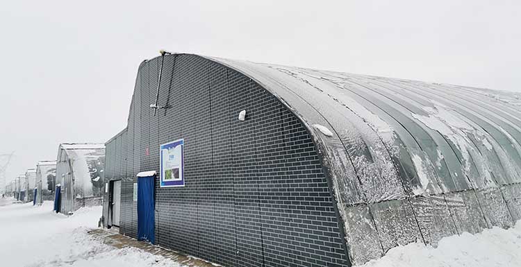3、保溫性:雙膜單被,隔熱保溫好。晴天,外界-30℃下,棚內(nèi)溫度可以達到8℃以上。冬季不加溫可以進行果菜類生產(chǎn)。